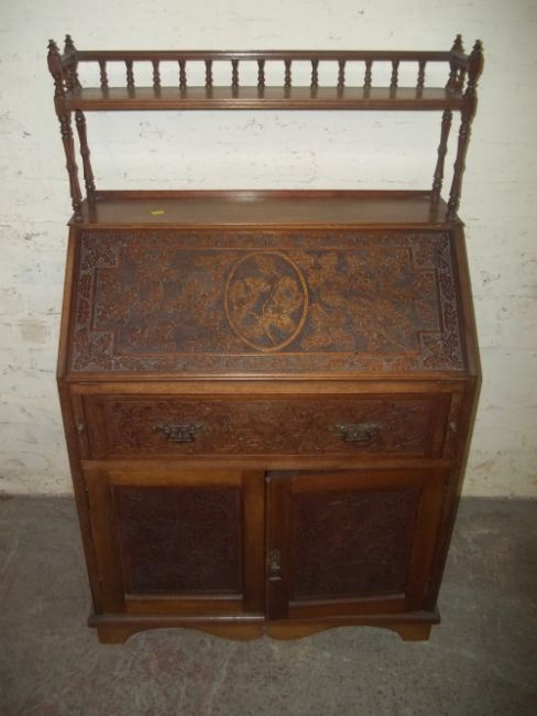 AN ANTIQUE BUREAU WITH GALLERY SHELF AND CHIPPENDALE LATTICE STYLE DESIGN