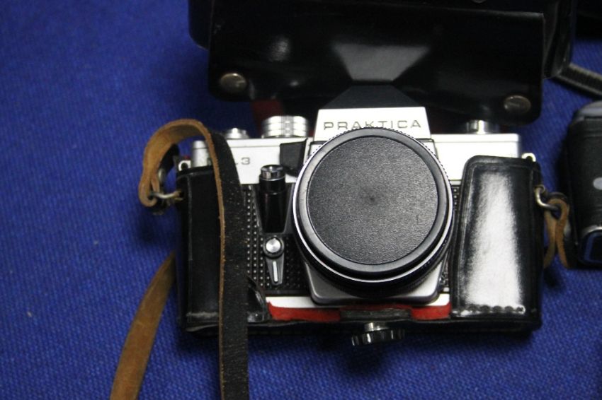 A TRAY OF CASED OR BOXED CAMERAS TO INCLUDE PRAKTICA MTL3 CHRYSTOLEUM (TRAY NOT INCLUDED)