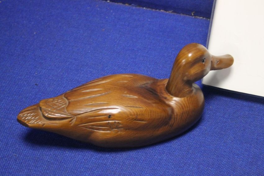 A CARVED WOODEN DUCK TOGETHER WITH "THE HISTORY OF THE 20TH CENTURY" BOOK