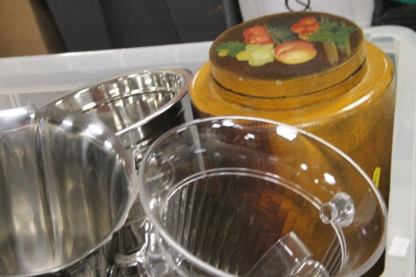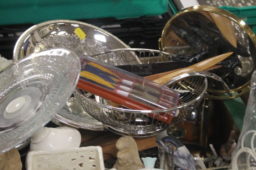 THREE TRAYS OF ASSORTED CERAMICS, SUNDRIES AND METALWARE (TRAYS NOT INCLUDED)