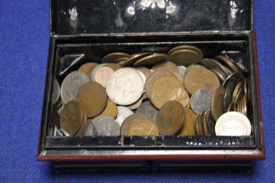 AN OLD FASHIONED SAVINGS BOX NO KEY CONTAINING LARGE QUANTITY OF ENGLISH COINAGE
