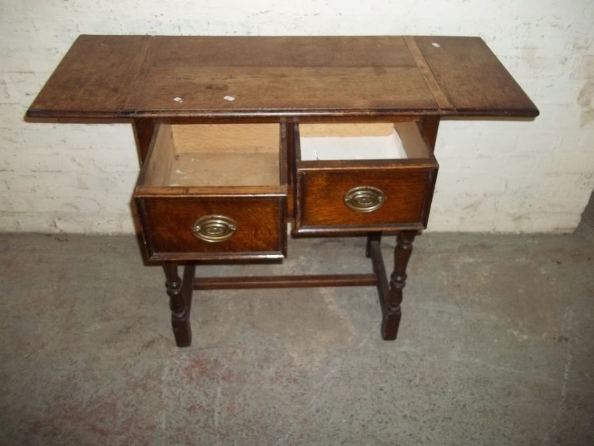 AN ANTIQUE DROPLEAF TWO DRAWER SIDE TABLE