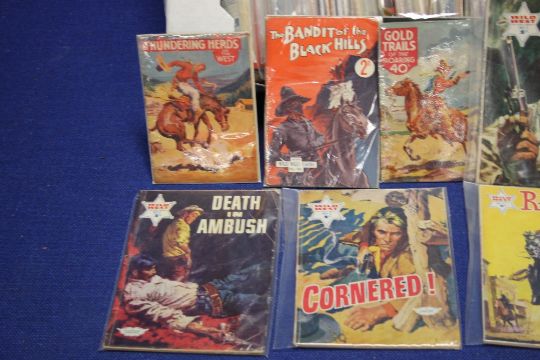 WILD WEST PICTURE LIBRARY COMICS comprising numbers 3, 4, 8, 10, 14, 15, 16, 17, 21, 23, 24, 26, 27, 29, 30, 31, 35, 36, 38, 40, 48, 50, 51, 52, 53, 54, 59, 61-69, 72, 73, 74, 75, 76, 79, 81, 84, 85, 87, 88, 89, 93, 98, 100, 101, 105, 107, 109, 110 together with three other wild west booklets "The Bandit of The Black Hills", "Thundering Herds of the West" and "Gold Trails of the Roaring 40s" (59)