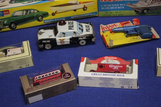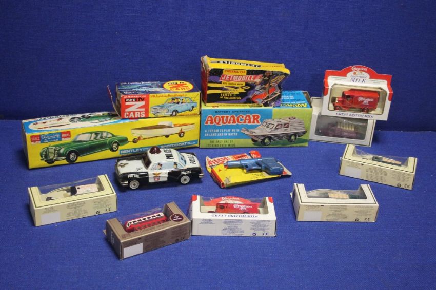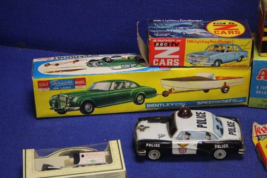A BOXED TELSALDA BENTLEY WITH SPEEDBOAT 20680, together with a boxed battery operated aqua car, boxed fireball XL5 etc