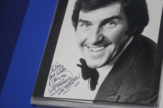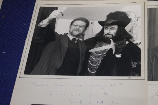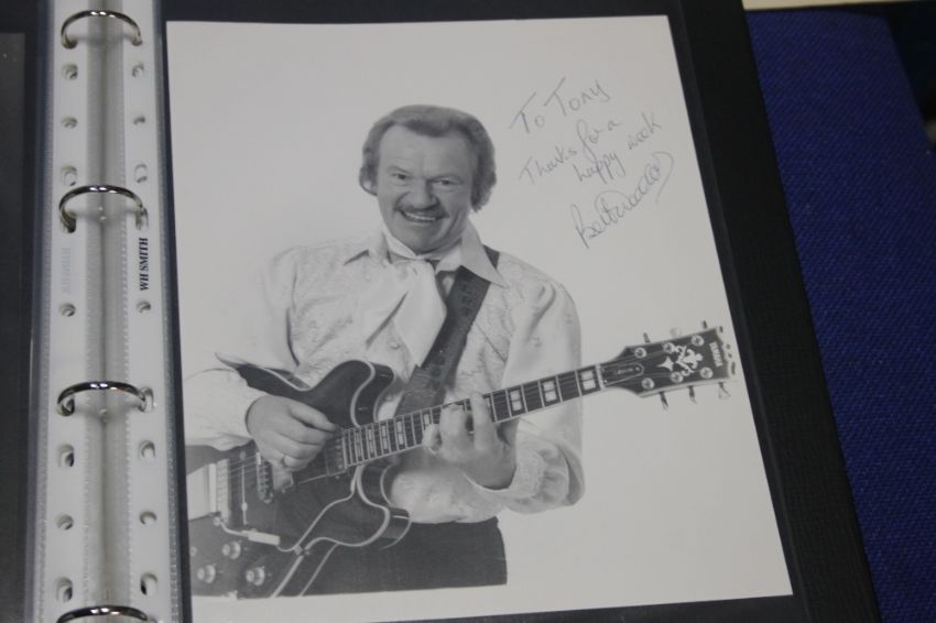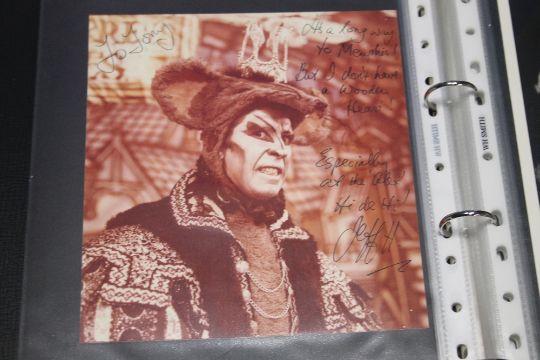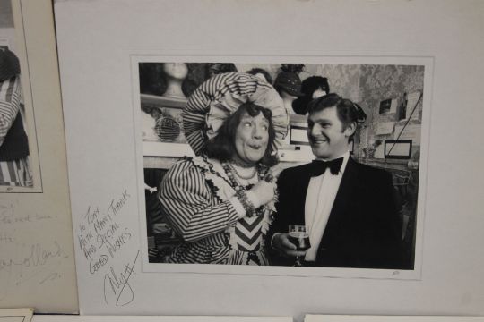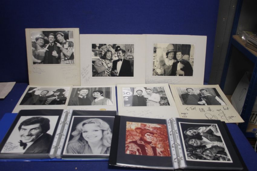 THREE FOLDERS CONTAINING AUTOGRAPHED PHOTOS OF THEATRE STARS, POP STARS,ETC OBTAINED FROM A THEATRE MANAGER, to include Norman Wisdom, Tommy Cooper, Les Dawson, Spike Milligan, Frankie Howard, Danny La Rue, Roy Chubby Brown, Roy Orbison, Three Degrees, etc, together with a collection of larger card backed autographs to include Ken Dodd, Little and Large, Jack Douglas, Paul Shane, Jill Gascoigne etc