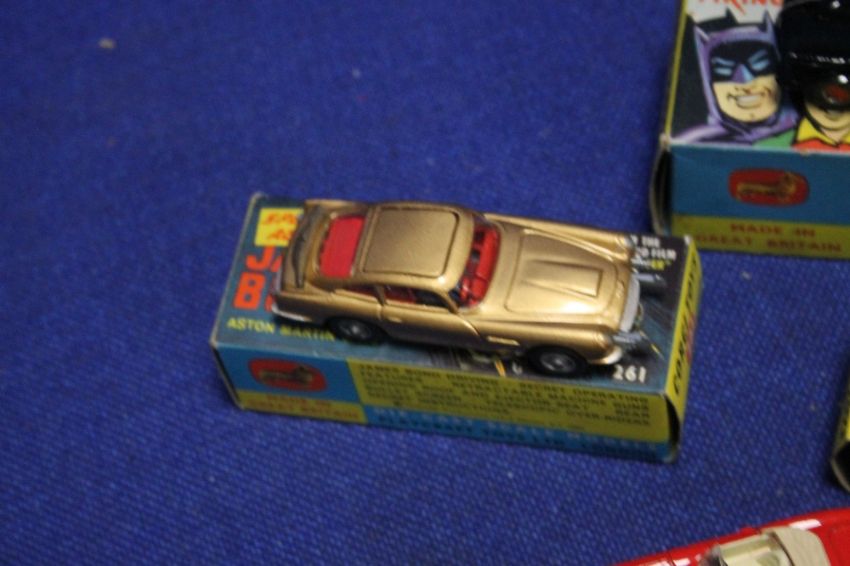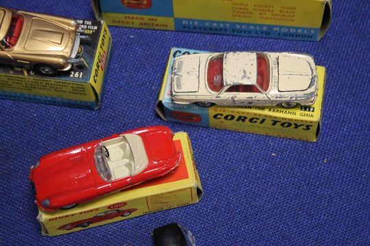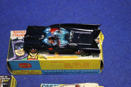A BOXED CORGI BAT MOBILE 267, together with a boxed James Bond Aston Martin 261, a boxed Corgi 1500 Karman Ghia, and a boxed Jaguar E Type 120 A/F