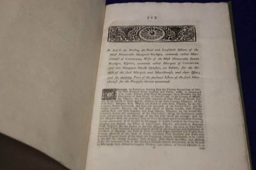 CARNARVAN ESTATE ACT. 32. GEO. 2 1759. "AN ACT FOR SETTLING THE REAL AND LEASEHOLD ESTATES OF THE MOST HONOURABLE MARGARET BRYDGES, COMMONLY CALLED MARCHIONESS OF CARNARVAN, wife of the most Honourable James Brydges, Esquire, commonly called Marquis of Carnarvan, and late Margaret Nicoll Spinster, an Infant, for the benefit of the said Marquis and Marchioness, and their issue; and for applying part of the personal estate of the said Marchioness for the purposes therein mentioned."