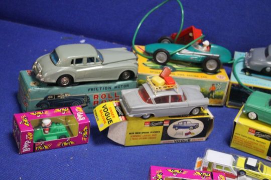 A BOXED VINTAGE TELSALDA SINGER VOGUE SALOON 20722, together with a boxed Morris minor 1000, a boxed Telsada Vauxhall Viva, a boxed Vanwall racing car, a boxed remote control Rolls royce, Silver Cloud Saloon, 4 boxed bump and go cars and a Majorette Mustang with caravan