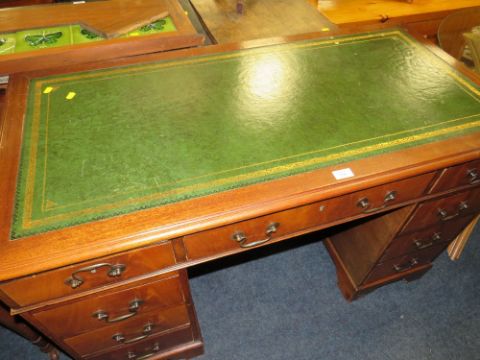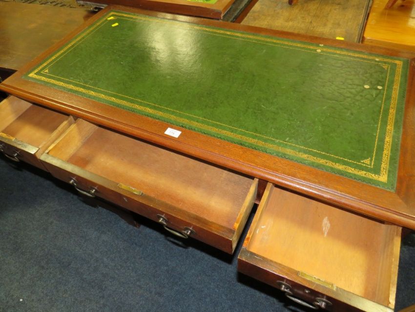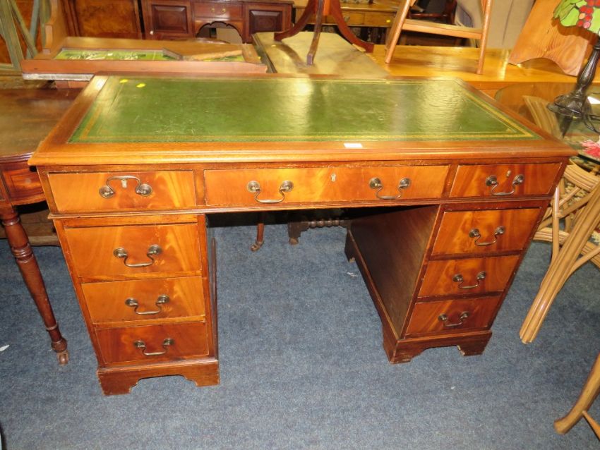 AN ANTIQUE MAHOGANY LEATHER TOPPED TWIN PEDESTAL DESK, W 121 CM