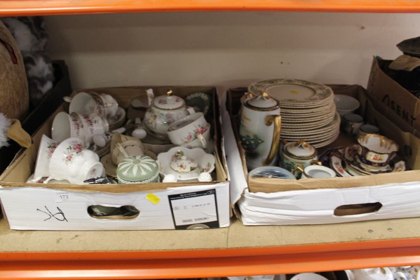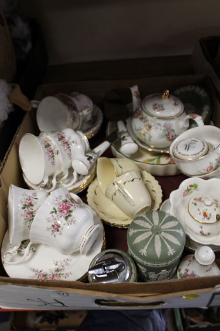 TWO TRAYS OF ASSORTED CHINA TO INCLUDE WEDGWOOD GREEN JASPERWARE, ROYAL ALBERT LAVENDER ROSE TEAWARE ETC