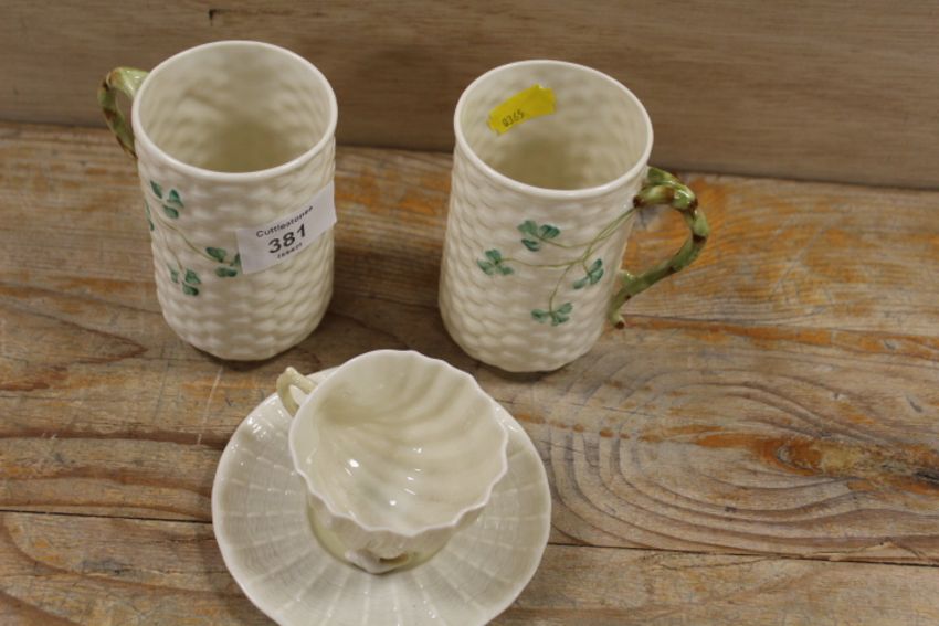 A BELLEEK CONCH SHELL SHAPED CUP AND SAUCER TOGETHER WITH TWO BELLEEK MUGS (3)