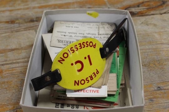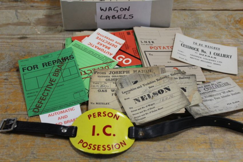 A QUANTITY OF VINTAGE RAILWAY EPHEMERA TO INCLUDE WAGON LABELS, ENAMEL ARM BAND ETC