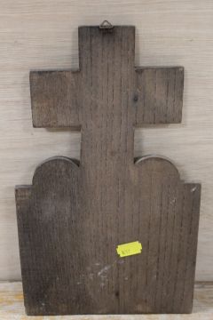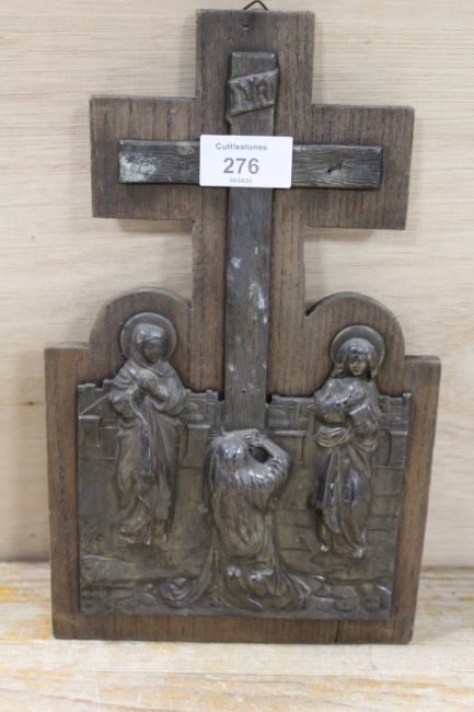 A CAST METAL RELIGIOUS SCENE MOUNTED ON A WOODEN PLAQUE