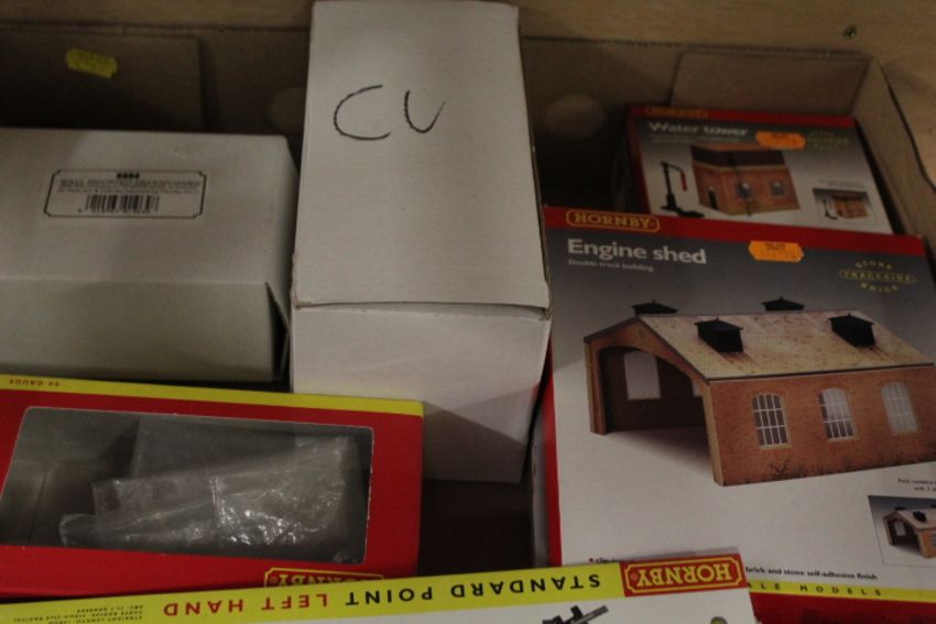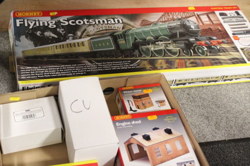 A BOXED HORNBY FLYING SCOTSMAN 'INCOMPLETE CONTENTS', TOGETHER WITH A QUANTITY OF HORNBY ACCESSORY BOXES - NO CONTENTS