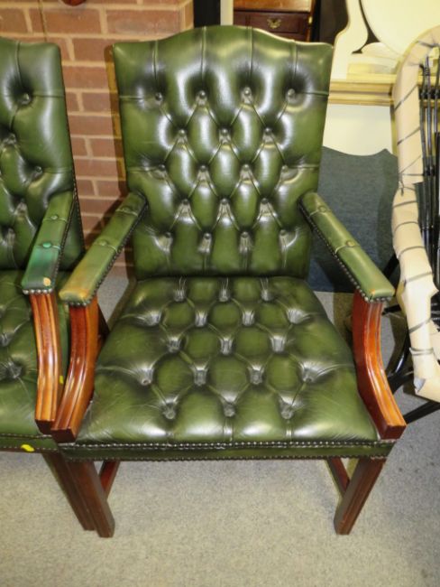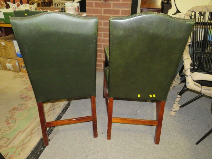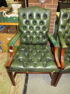 A PAIR OF REPRODUCTION GREEN LEATHER ARMCHAIRS