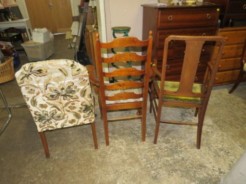 AN EDWARDIAN MAHOGANY CHAIR, AN UPHOLSTERED ARMCHAIR AND AN OAK CHAIR (3)