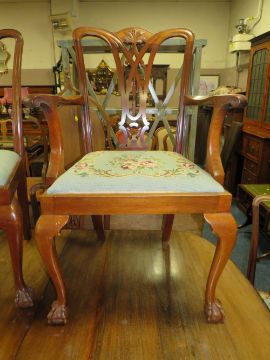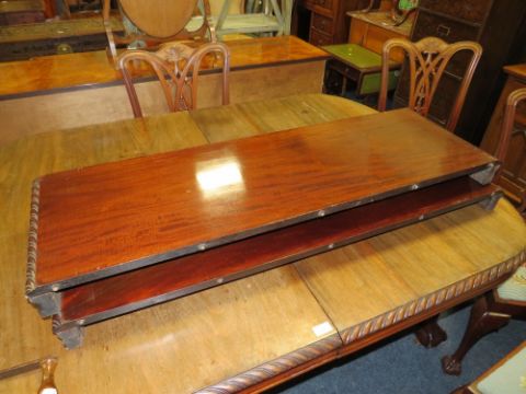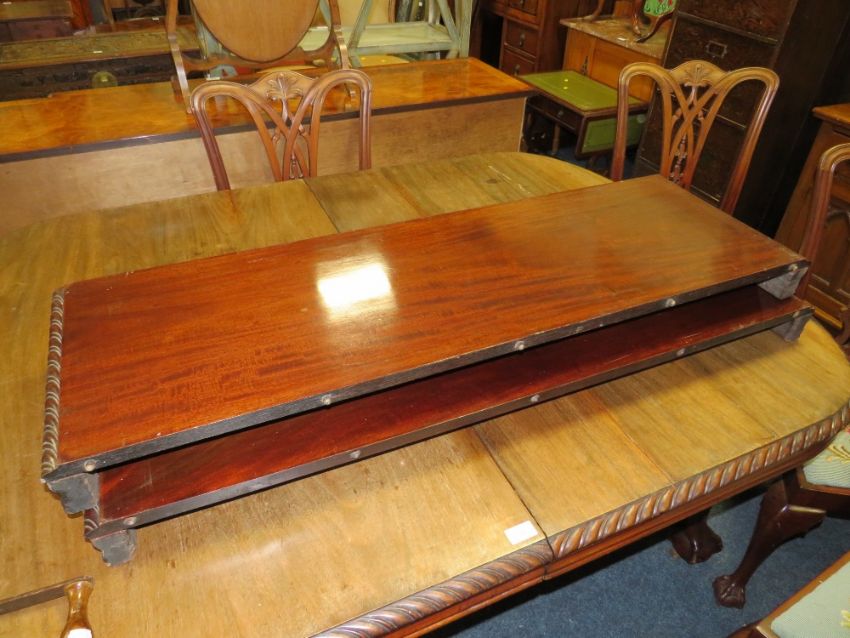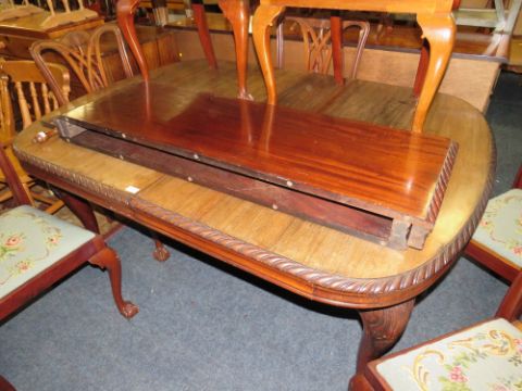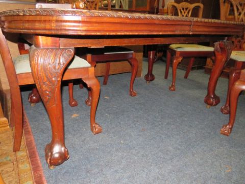 A LARGE EARLY 20TH CENTURY MAHOGANY SIDEBOARD, WIND-OUT DINING TABLE AND 7 CHAIRS ON BALL AND CLAW FEET