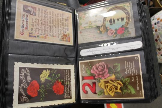 SEVEN ALBUMS OF ASSORTED VINTAGE POSTCARDS, TO INCLUDE MILITARY EXAMPLES, GREETINGS POSTCARDS, ROMANCE INTEREST COLLECTION, TOPOGRAPHICAL ETC
