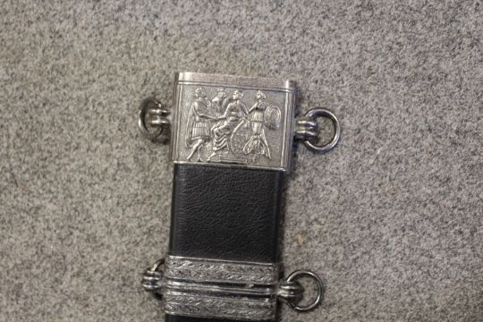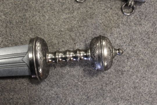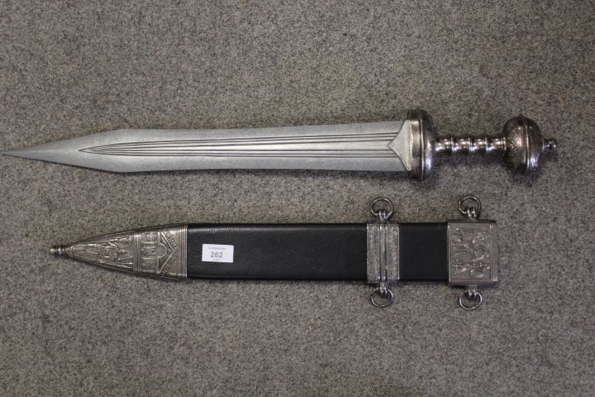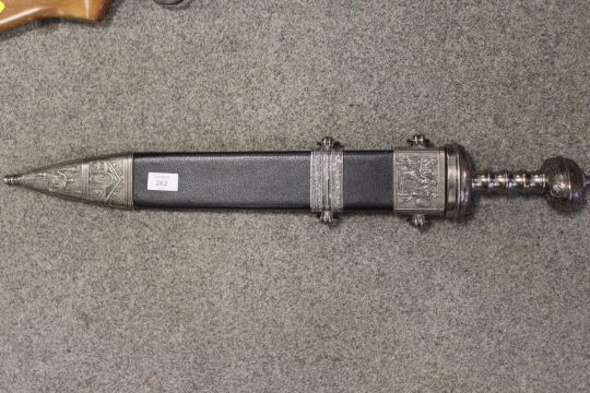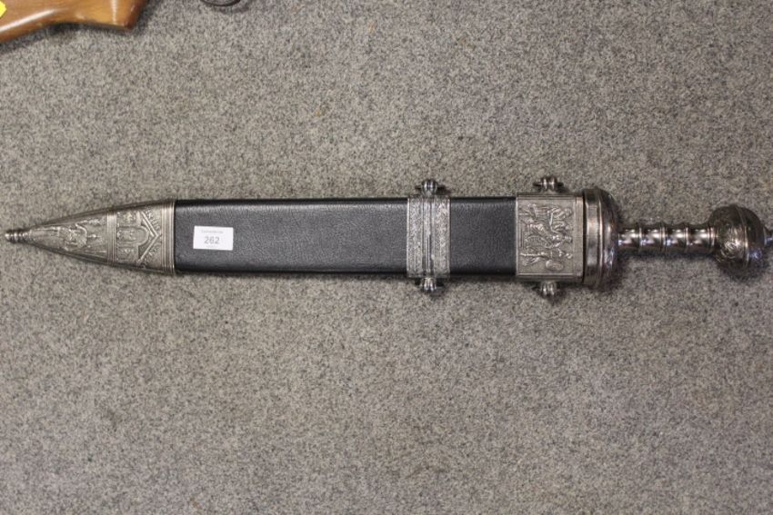 A MODERN COPY OF A GLADIUS SWORD IN METAL DECORATIVE SCABBARD