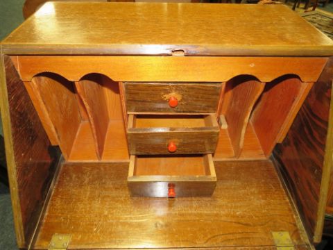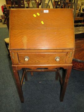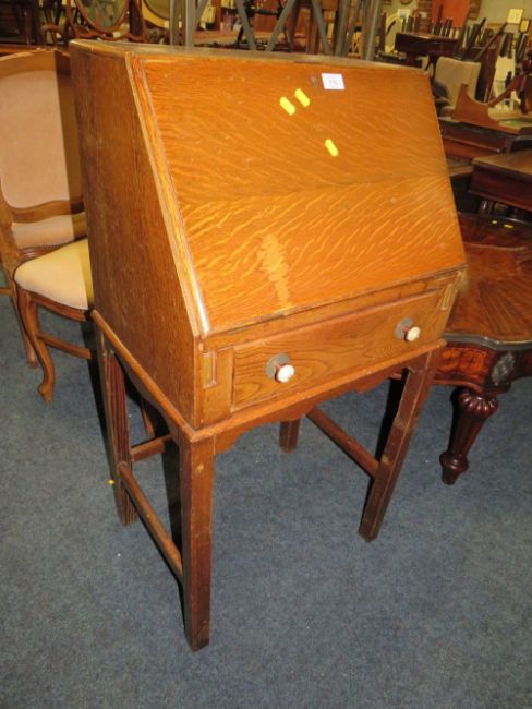 A SMALL VINTAGE OAK BUREAU AND TWO CHAIRS (3)