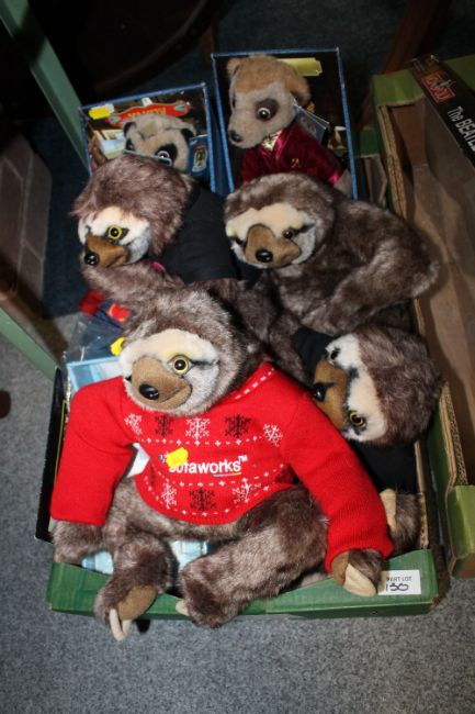 TWO TRAYS OF ASSORTED TOYS AND GAMES TO INCLUDE MEERKATS, SLOTHS ETC AND THREE COLLECTORS EDITION MONOPOLY GAMES TO INCLUDE THE BEATLES ETC