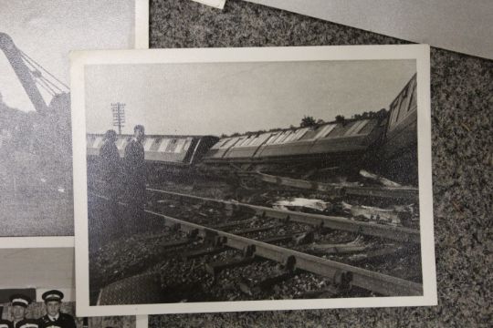 A SELECTION OF CATALOGUES AND EPHEMERA TO INCLUDE VINTAGE BLACK & WHITE LOCOMOTIVE CRASH SCENE PHOTOS, AIRCRAFT ETC