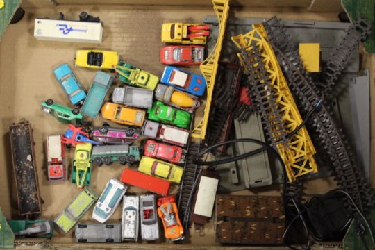 A TRAY OF ASSORTED DIECAST VEHICLES, RAILWAY ACCESSORIES ETC TOGETHER WITH TRAY OF ASSORTED METALWARE AND COLLECTABLES (2)
