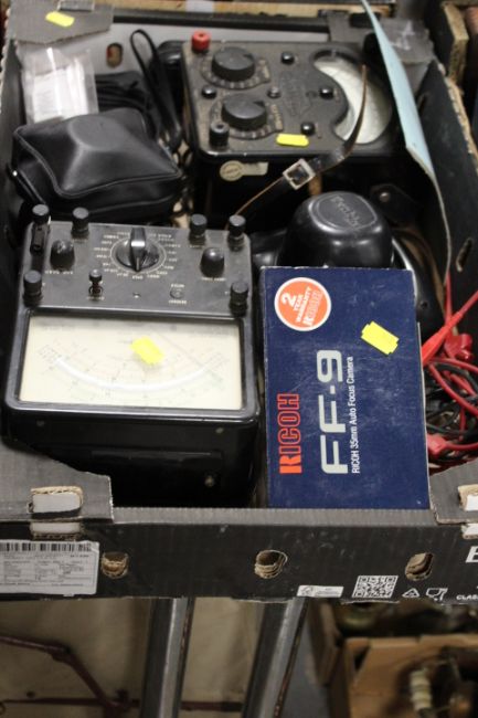 A TRAY OF ASSORTED CAMERAS, AVOMETER ETC