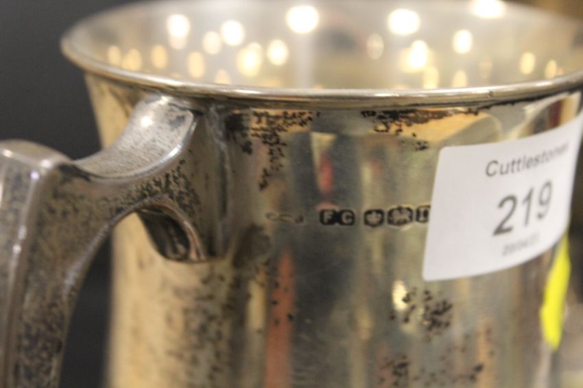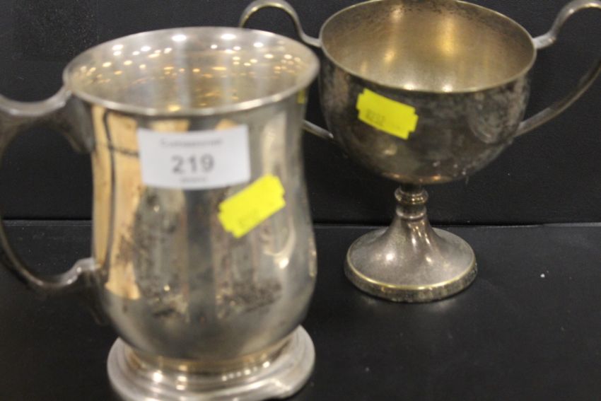 A HALLMARKED SILVER TANKARD - APPROX WEIGHT 317 G TOGETHER WITH A SILVER PLATED TWIN HANDLED TROPHY (2)