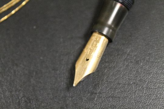 A HALLMARKED 9CT GOLD THREE STRAND NECKLACE TOGETHER WITH A 14 CT GOLD NIBBED FOUNTAIN PEN (2)