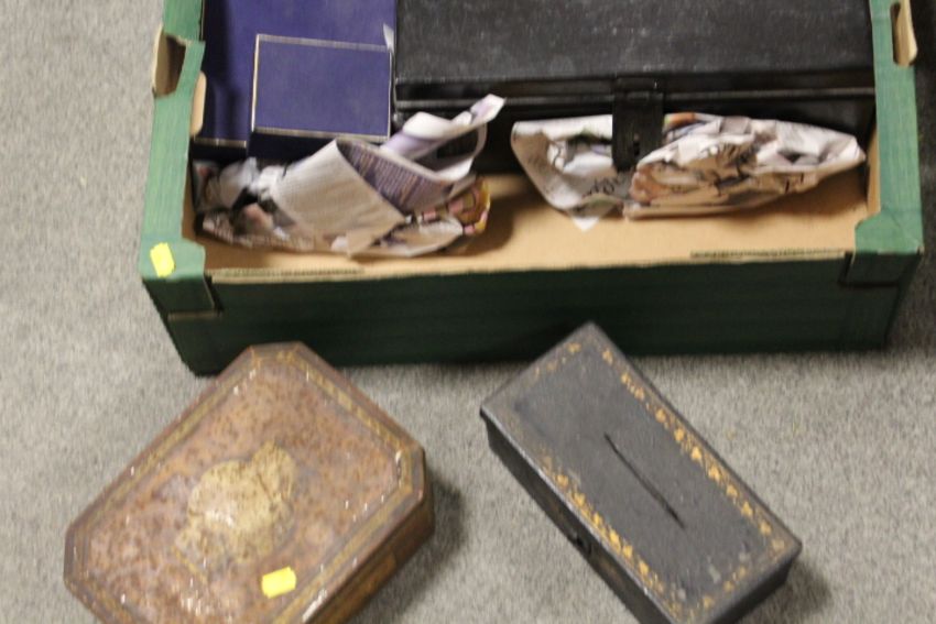 TWO TRAYS OF COLLECTABLE TINS AND BOXES ETC
