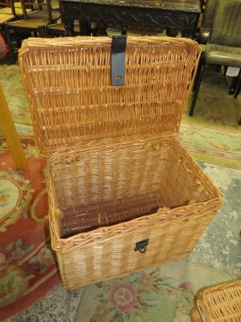 A LARGE WICKER BASKET TOGETHER WITH A SMALLER WICKER HAMPER BASKET
