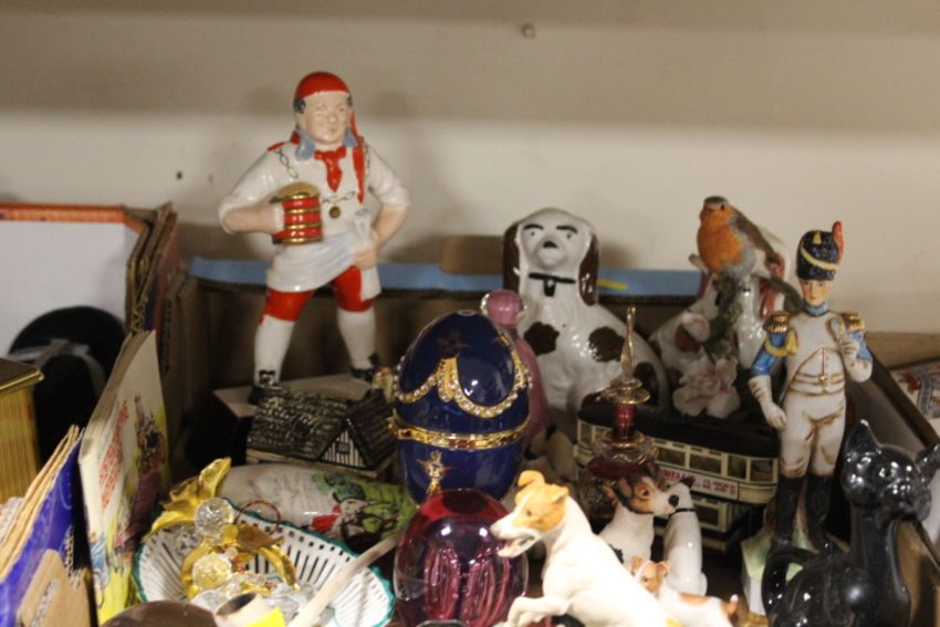 TWO TRAYS OF ASSORTED CERAMICS ETC TO INCLUDE JACK RUSSELL FIGURES