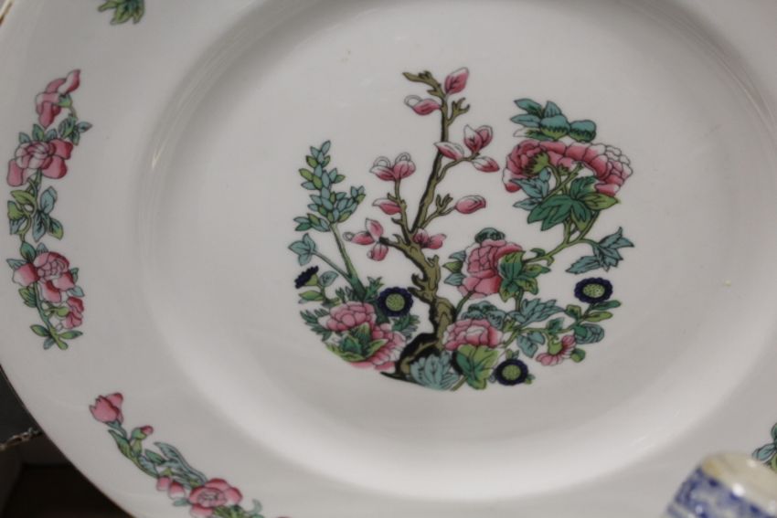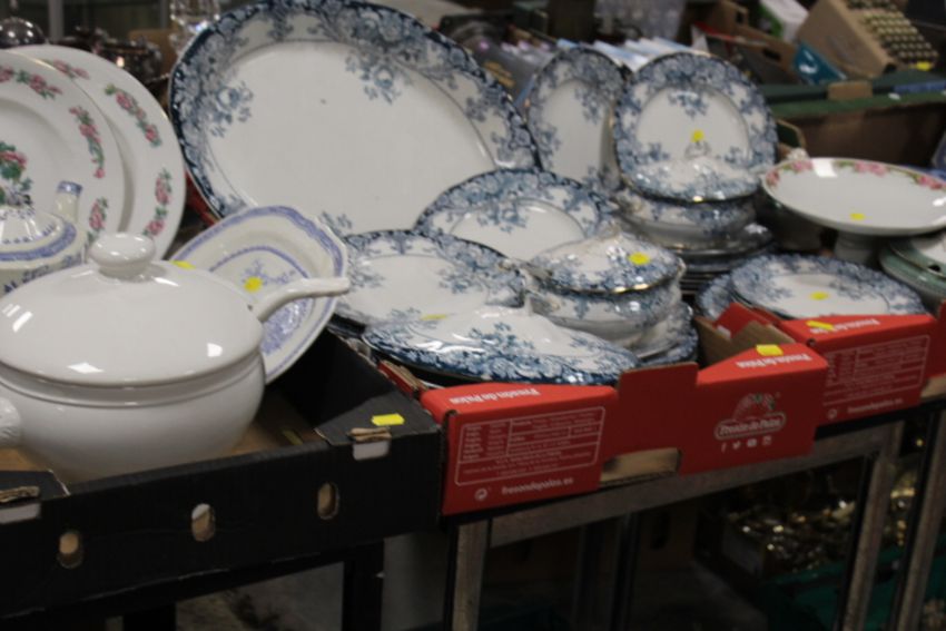 THREE TRAYS OF ASSORTED ANTIQUE AND LATER DINNERWARE TO INCLUDE TUREENS, LADLES ETC