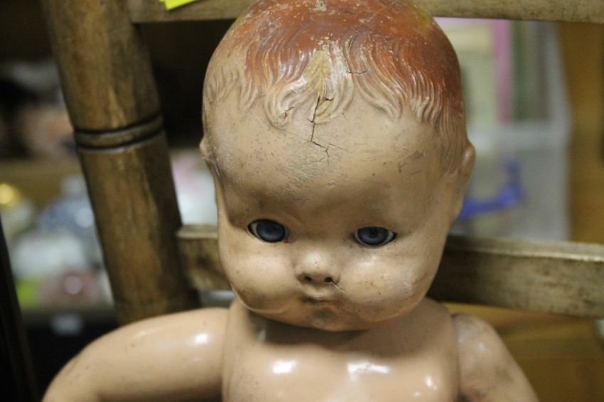 A VINTAGE CHILDS CHAIR TOGETHER WITH A DOLL