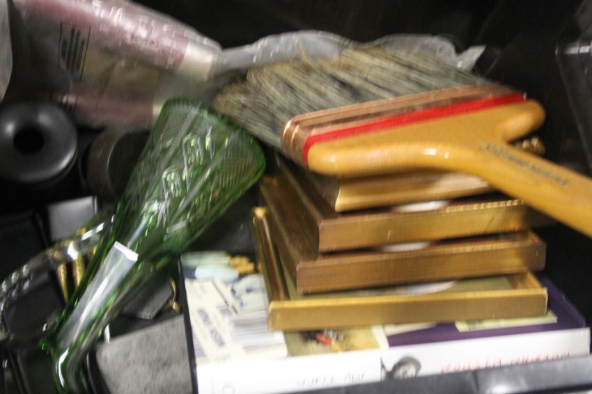 A TRAY OF ASSORTED SUNDRIES TOGETHER WITH A CERAMIC PLANTER ETC (TRAY/S NOT INCLUDED)