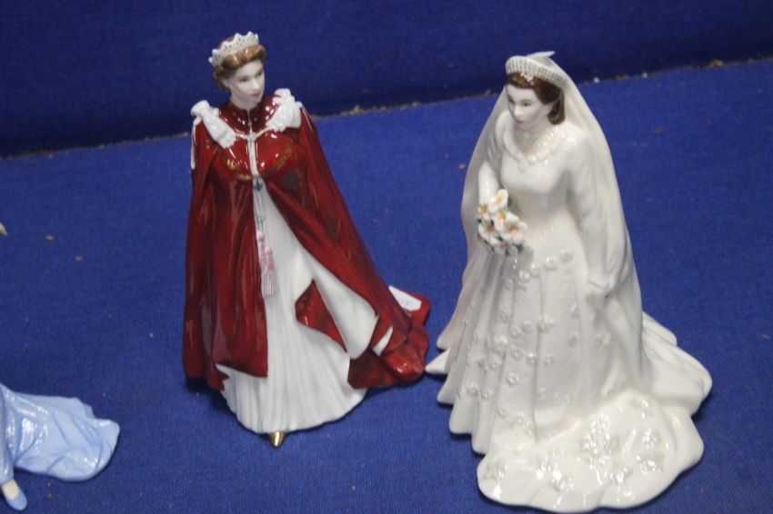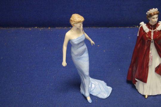 TWO ROYAL WORCESTER FIGURES AND QUEEN ELIZABETH II TOGETHER WITH A ROYAL DOULTON FIGURINE OF LADY DIANA