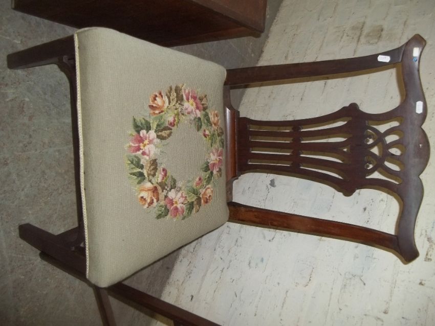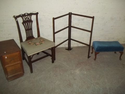 THREE ANTIQUE ITEMS TO INCLUDE A TOWEL RAIL, A DINING CHAIR, A QUEEN ANNE FOOTSTOOL PLUS A MODERN SMALL CHEST OF DRAWERS