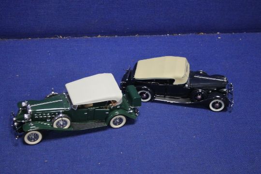 TWO DANBURY MINT CARS TO INCLUDE A BLUE 1936 PACKARD SPORT PHANTOM TOGETHER WITH A 1932 GREEN CADILLAC