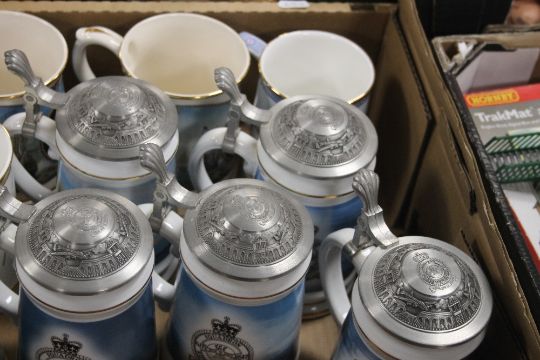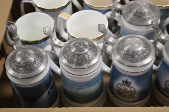 A TRAY OF ROYAL DOULTON MUGS TOGETHER WITH A COLLECTION OF BEER STEINS (TRAY/S NOT INCLUDED)