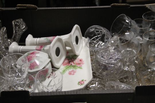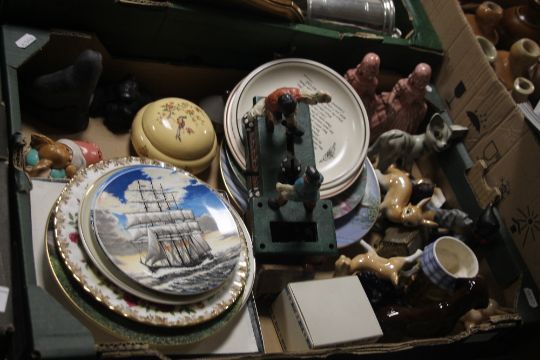 THREE TRAYS OF SUNDRIES AND CERAMICS TO INCLUDE CERAMIC EGGS, VINTAGE MONEY BOX A/F ETC
