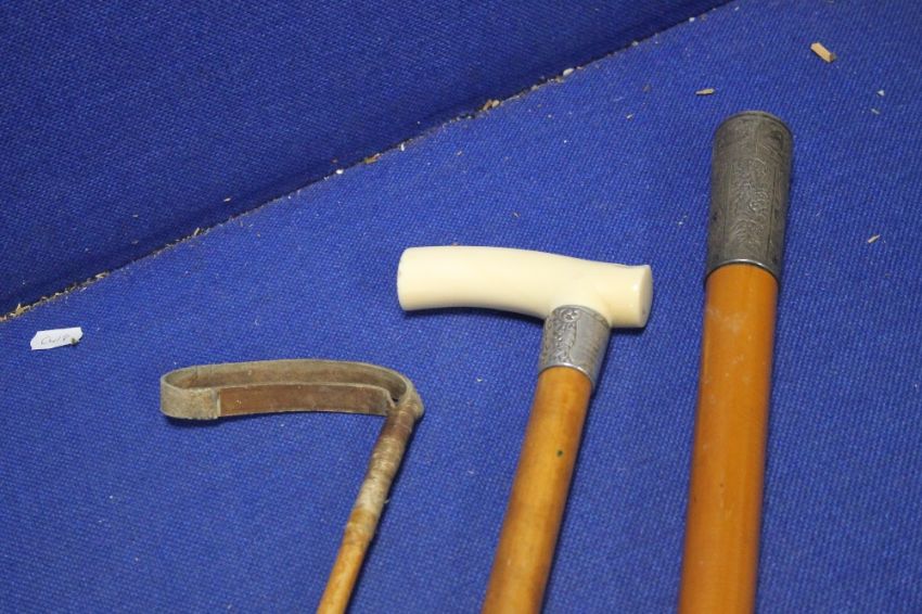 A VINTAGE BANDED WALKING STICK WITH INSCRIPTION DATED 1894, TOGETHER WITH A RIDING WHIP AND ANOTHER WHITE METAL TOPPED VINTAGE WALKING STICK
