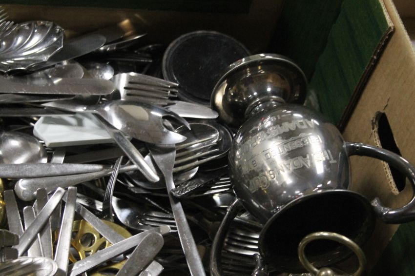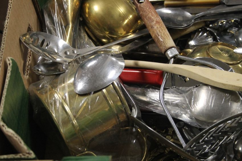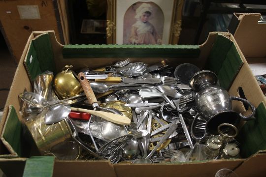 A TRAY OF ASSORTED METALWARE (TRAY/S NOT INCLUDED)