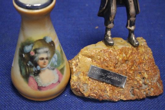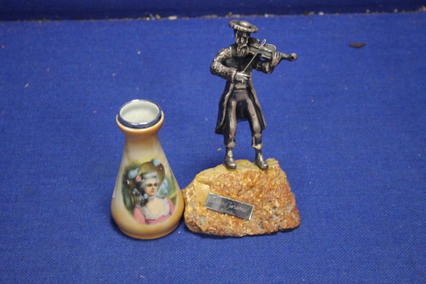 AN ISSAC JEHSKEL FIGURE OF A FIDDLE PLAYER, MARKED 925, AND A VINTAGE SILVER TOP VASE (2)
