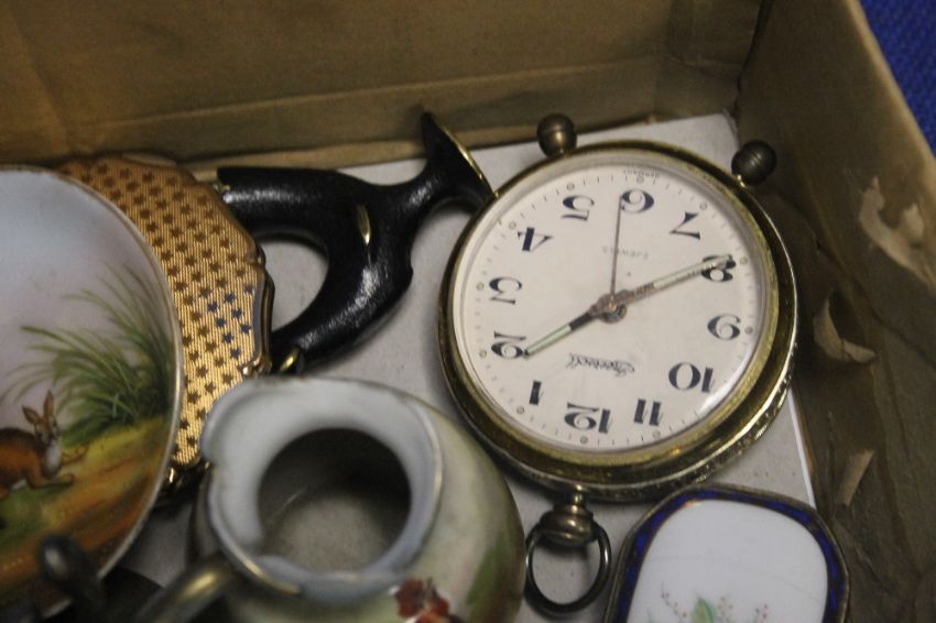 A BOX OF COLLECTABLES TO INCLUDE AN INGERSOL WATCH, CERAMICS ETC