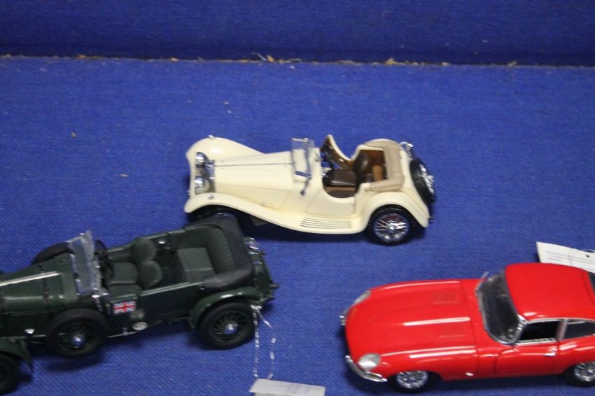 THREE FRANKLIN MINT CARS A RED TYPE JAGUAR, A WHITE JAGUAR AND A GREEN 1929 BENTLEY