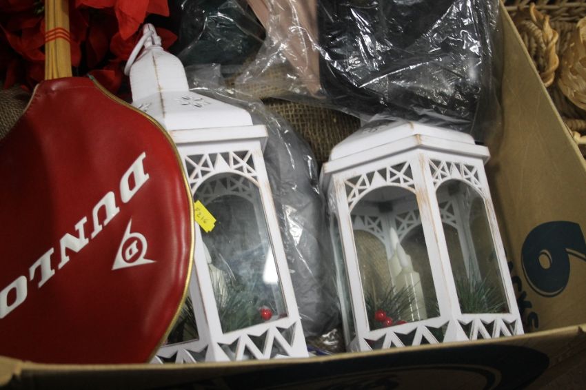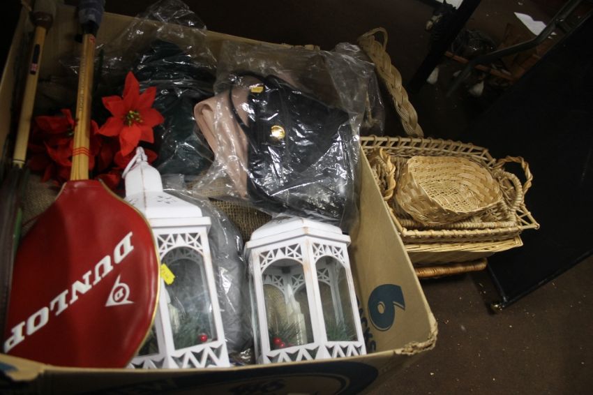 A TRAY OF ASSORTED SUNDRIES TOGETHER WITH A COLLECTION OF WICKER BASKETS (TRAY/S NOT INCLUDED)