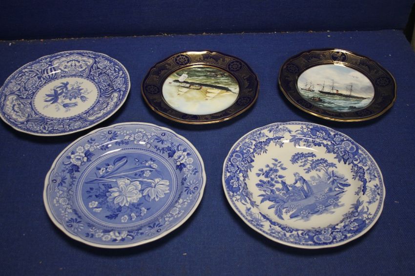 THREE BOXED SPODE BLUE AND WHITE PLATES TOGETHER WITH 2 UNBOXED SPODE CUNARD SHIP PLATES