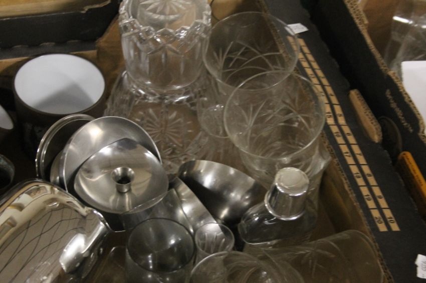 A TRAY OF SUNDRIES TO INCLUDE GLASSWARE, METALWARE ETC (TRAY/S NOT INCLUDED)