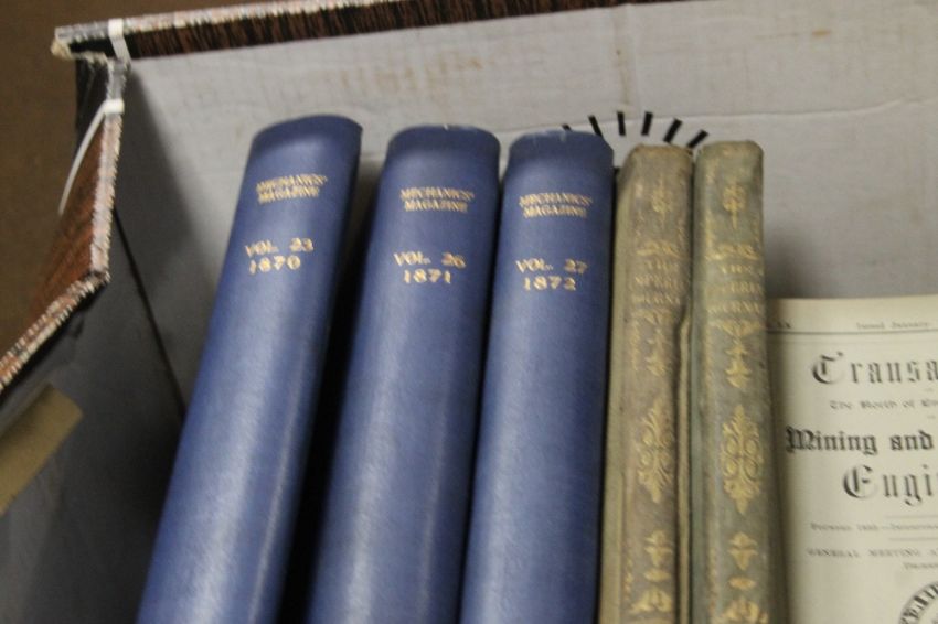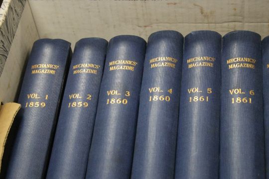 THIRTEEN VOLUMES THE MECHANICS MAGAZINEMANY FINE ILLUSTRATIONS INCLUDING FOLDING IN FINE CONDITION, library binding in scarce condition 2 volumes of imperial journal of art, science mechanic and engineering circa 1860 many illustrations including folding maps, 45 issues north of england institute of mining and mechanics 1900-1913